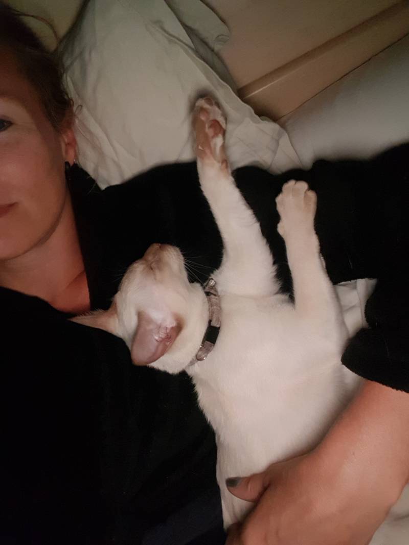 Haar favoriete plekjes zijn in mijn oksel, op de stoel en in een heel hoog hang mandje waar de andere katjes niet in durven te klimmen en..... onze enige nagenoeg Witte Tonkanees heeft zich ontwikkeld tot een stof roller! Er is één plekje in de tuin net wat stof waar het gras dood is gegaan door de hitte. Nou, daar rolt ze dus precies midden in! Dus als u eens op bezoek komt bij ons en er loopt een gevlekte kat, dan is dat Flora 🙄😏