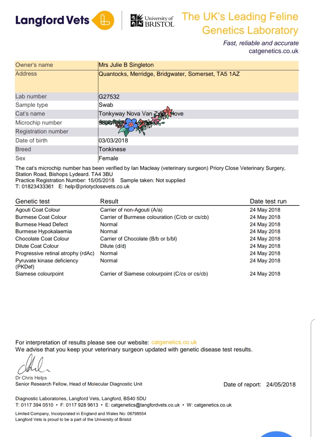 Genetisch - kleurtjes... en voor de lol hebben we ook de vachtkleuren laten testen. Ze draagt bruin, choc, blue en verdunning. Bb Dd Aa